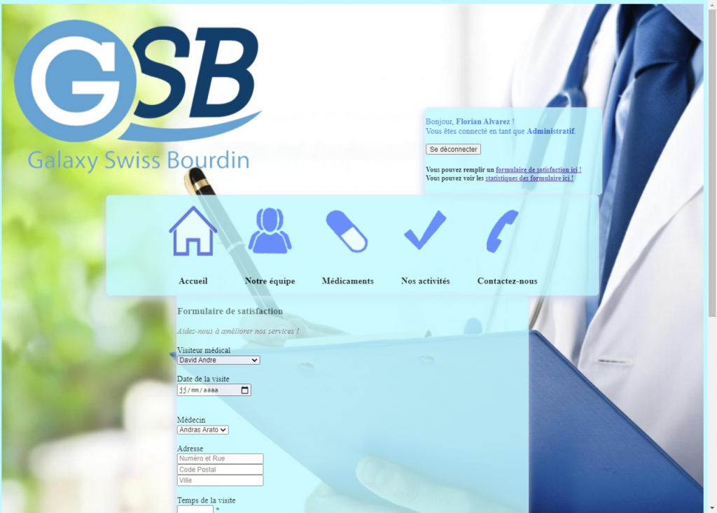 Puis notre travail était divisé en deux modules au choix : Celui que j’ai choisi fut la réalisation d’un formulaire de satisfaction du client (visiteurs médicaux) et d’une page de statistiques affichant les résultats de ces formulaires, qui sont stockées dans une base de données du site.